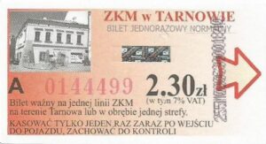 - ZKM w Tarnowie, niepogrubiona litera serii, kolorowe tło, strzałka z prawej strony biletu [kontur koloru tła], hologram DKK, w tym 7% VAT:
