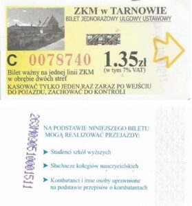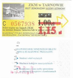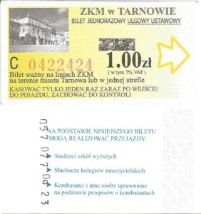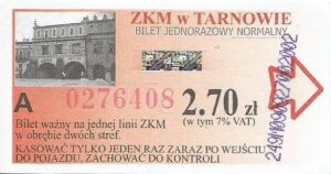 - ZKM w Tarnowie, kolorowe tło, strzałka z prawej strony biletu [kontur koloru tła], hologram DKK, w tym 7% VAT: