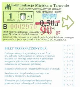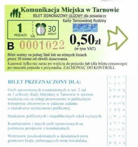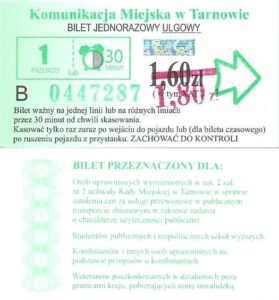 - Komunikacja Miejska w Tarnowie, obrazek w lewym górnym rogu, kolorowe tło, strzałka z prawej strony biletu [kontur koloru tła], hologram GRAF, w tym VAT: