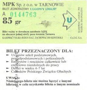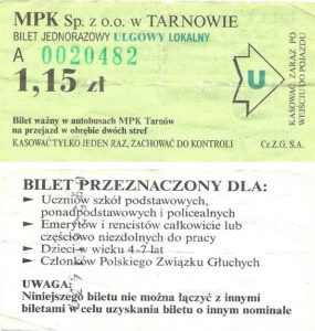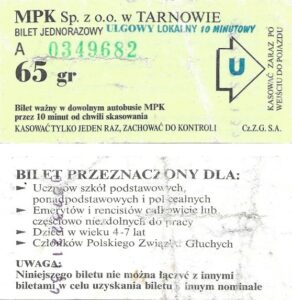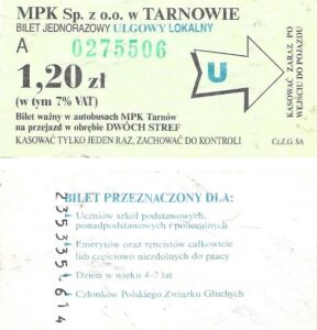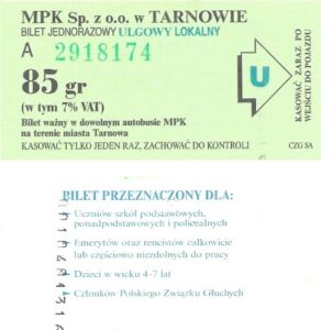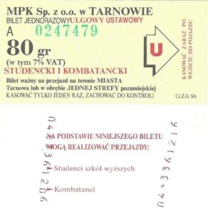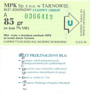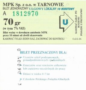 - MPK Sp. z o.o. w Tarnowie, numerator nad ceną, U/N w strzałce, w tym 7% VAT, małe CZG SA: