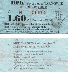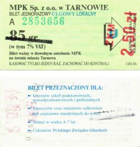 - MPK Sp. z o.o. w Tarnowie, niebieskie tło, cena zawiera 7% VAT: