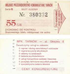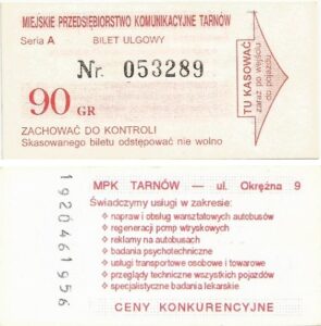 - Miejskie Przedsiębiorstwo Komunikacyjne Tarnów, numerator pod ceną, U/N w strzałce, Cz.Z.G.: