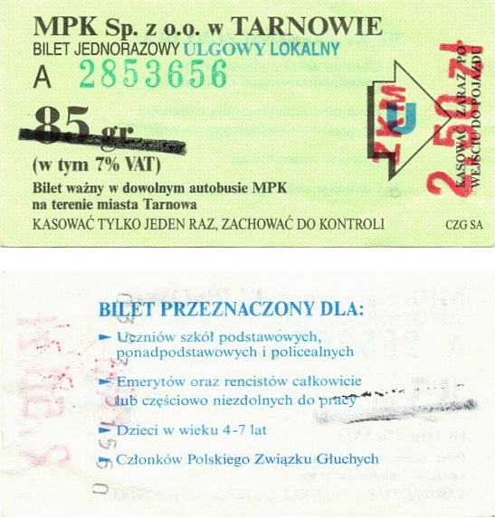 - MPK Sp. z o.o. w Tarnowie, numerator nad ceną, U/N w strzałce, w tym 7% VAT, małe CZG SA: