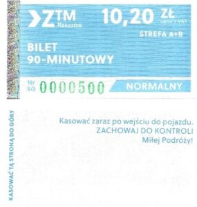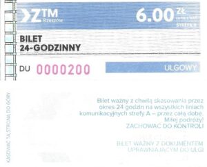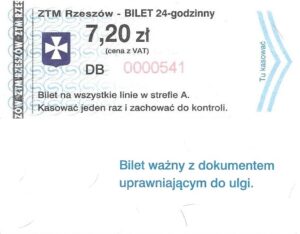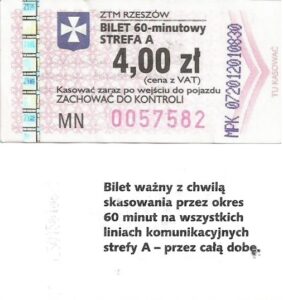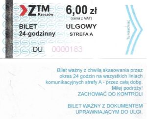 - Logo ZTM Rzeszów, oznaczenie stref, hologram DCZG Ochrona Security:
