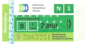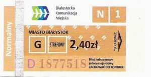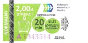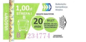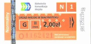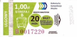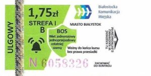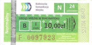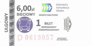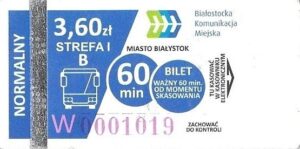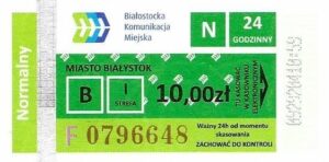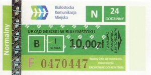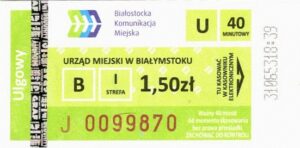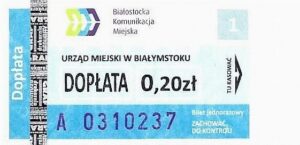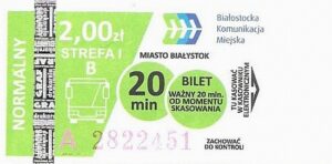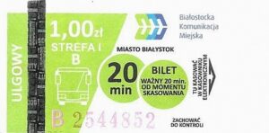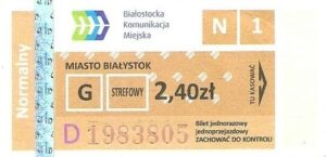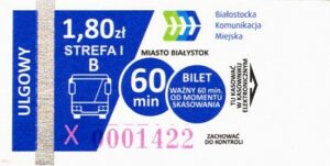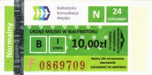 - Miasto Białystok, logo BKM, pole na wydruk kasownika, hologram DKK: