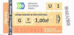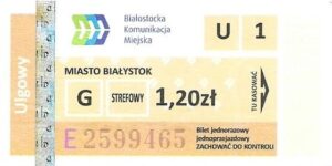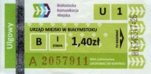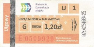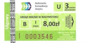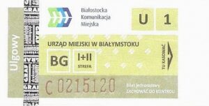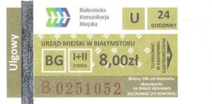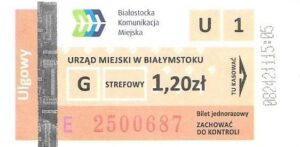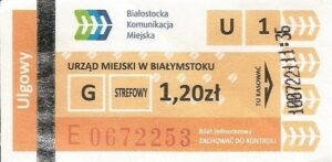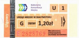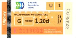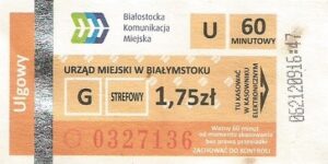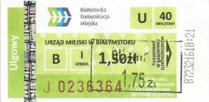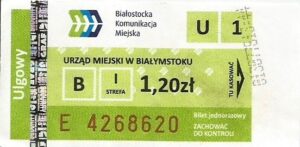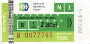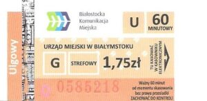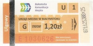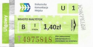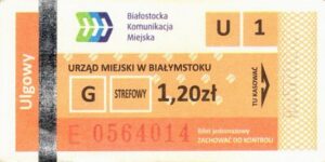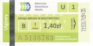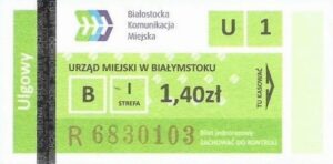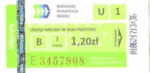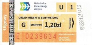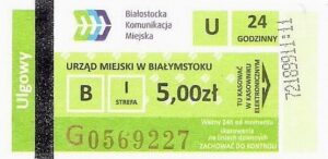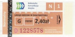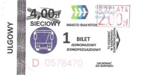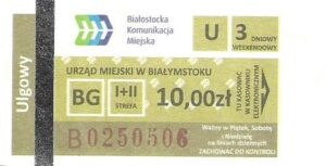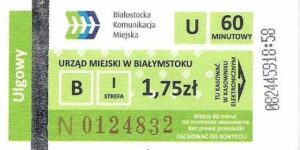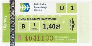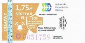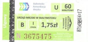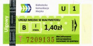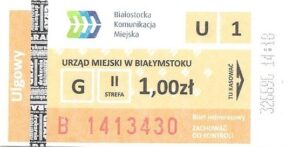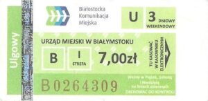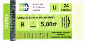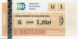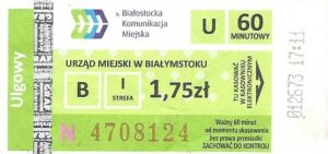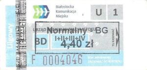 - Urząd Miejski w Białymstoku, logo BKM, pole na wydruk kasownika (w polu prostokąt), hologram GRAF: