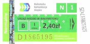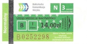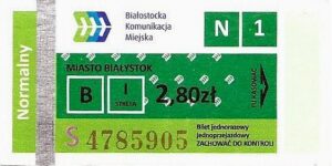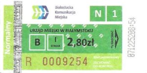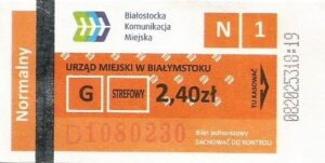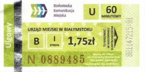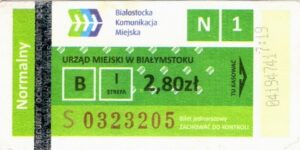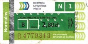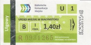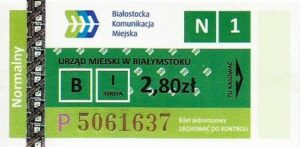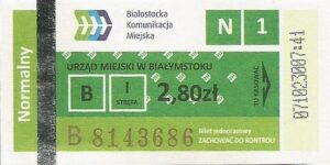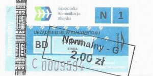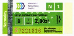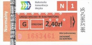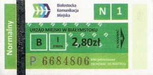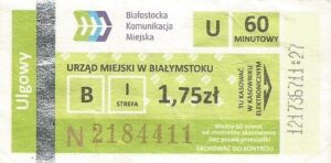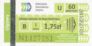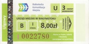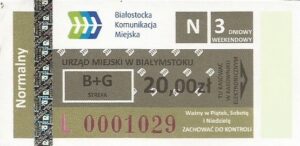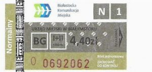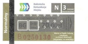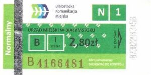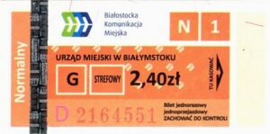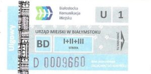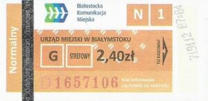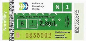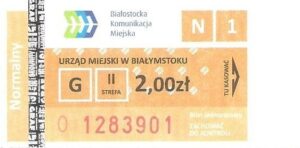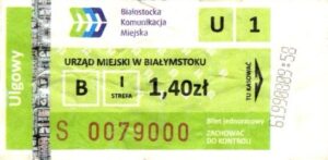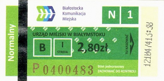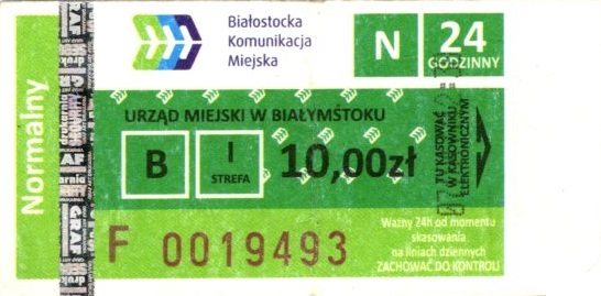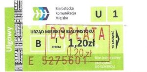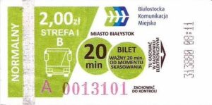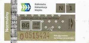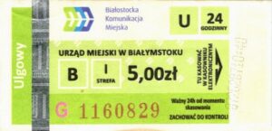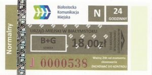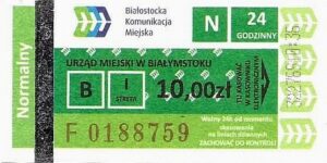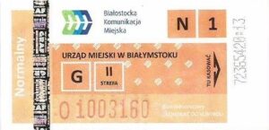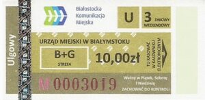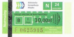 - Urząd Miejski w Białymstoku, logo BKM, pole na wydruk kasownika (w polu loga BKM), hologram CZG Ochrona: