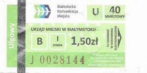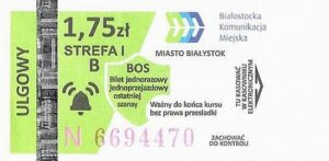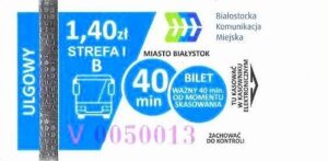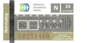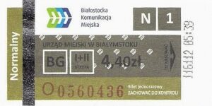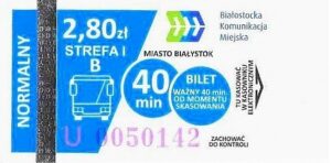 - Miasto Białystok, logo BKM, pole na wydruk kasownika, hologram SECURITY: