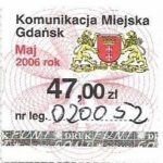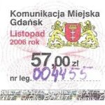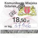 - Komunikacja Miejska w Gdańsku, herb miasta, ulgowy/pełnopłatny, w tle mikrodruk „Komunikacja Miejska Gdańsk”: