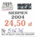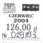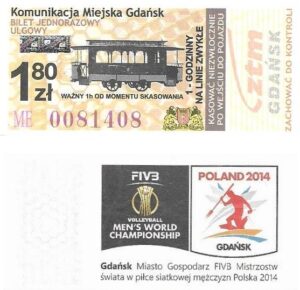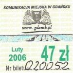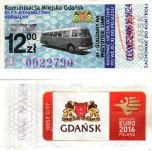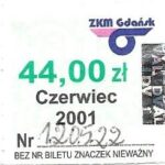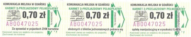 - Komunikacja Miejska Gdańsk, tło jednolite, herb miasta, logo ZTM w polu na wydruk z kasownika, wizerunki pojazdów w tle ceny: