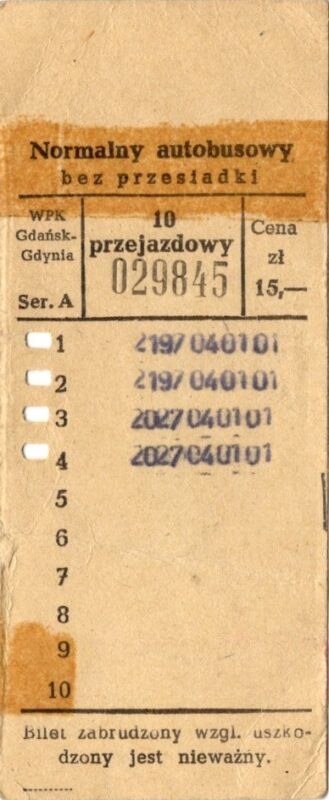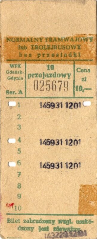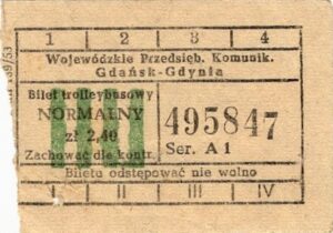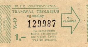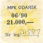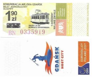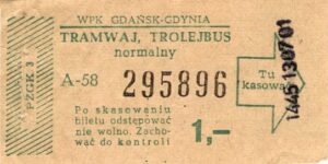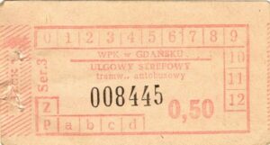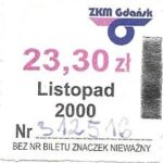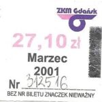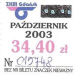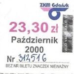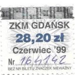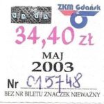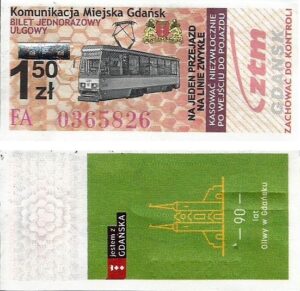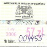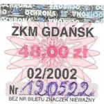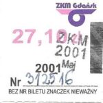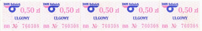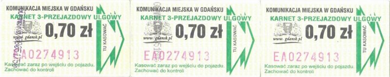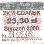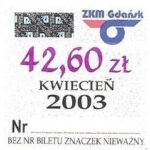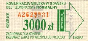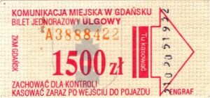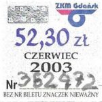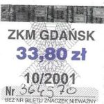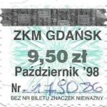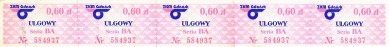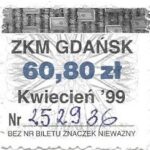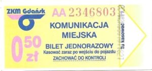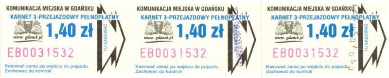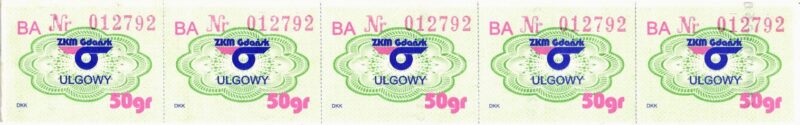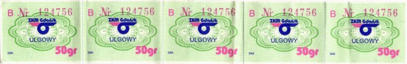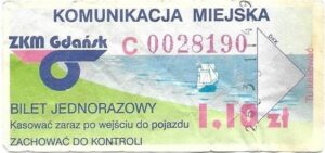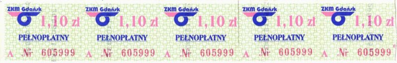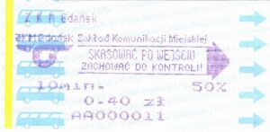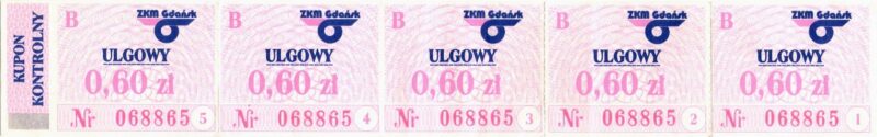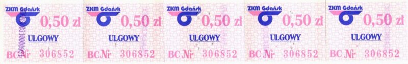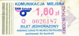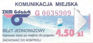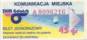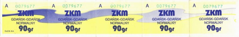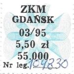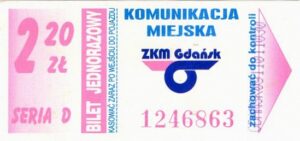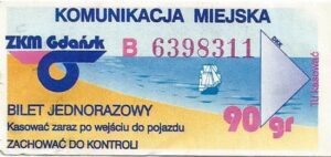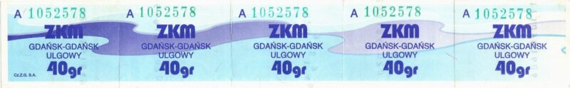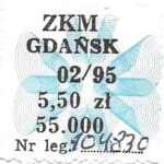 - Komunikacja Miejska Gdańsk, w tle herb miasta, tło „kwadraty i co 2 miejsca umieszczone koła”, z lewej strony biletu napis „ZKM GDAŃSK”, pole na wydruk kasownika, w prawym dolnym rogu napis „engraf”:
