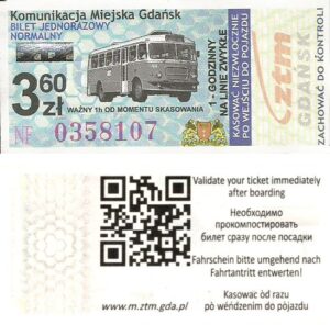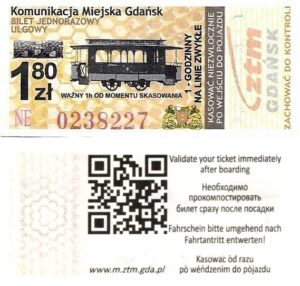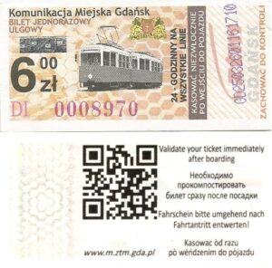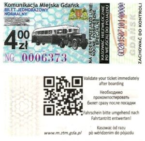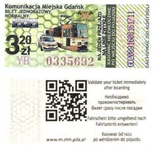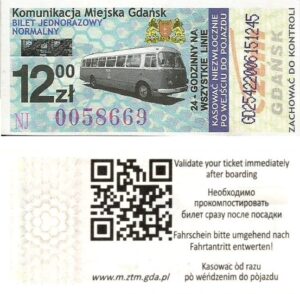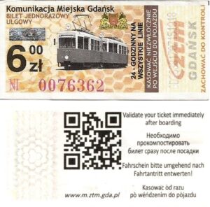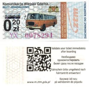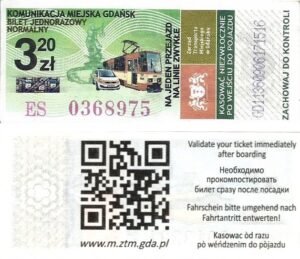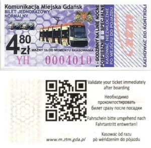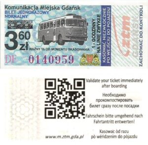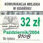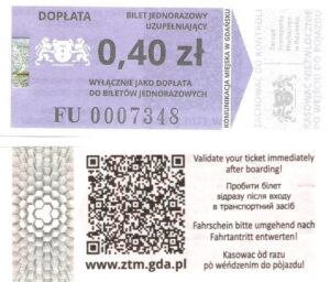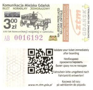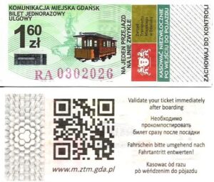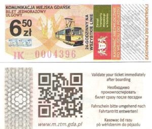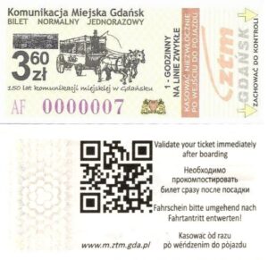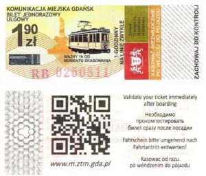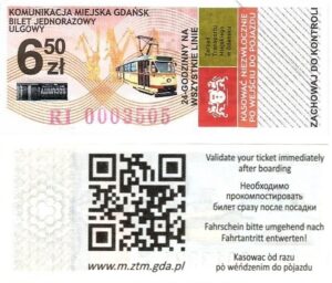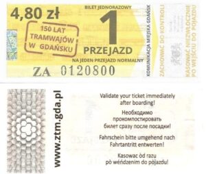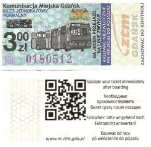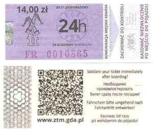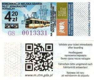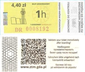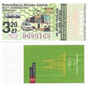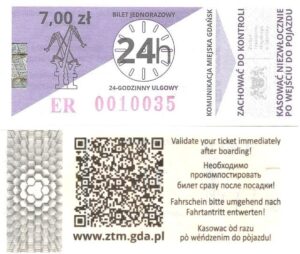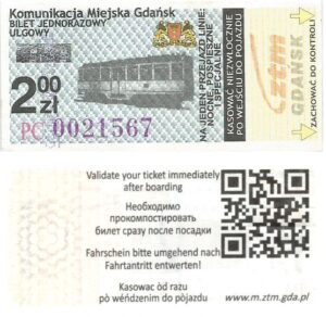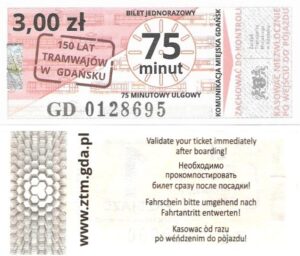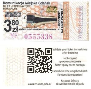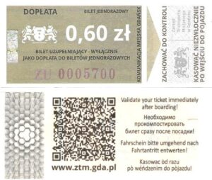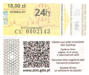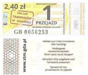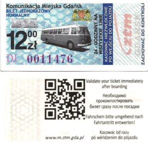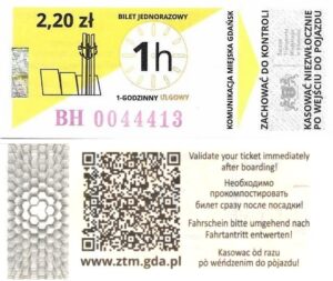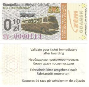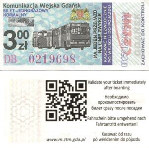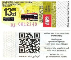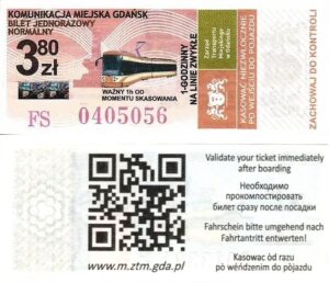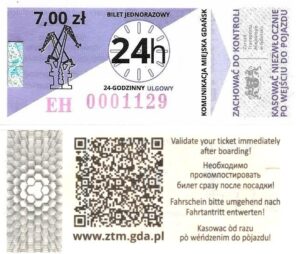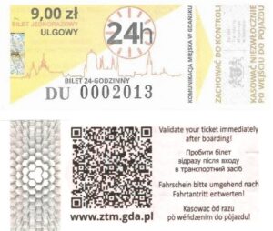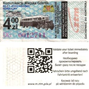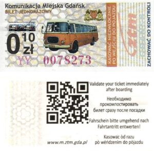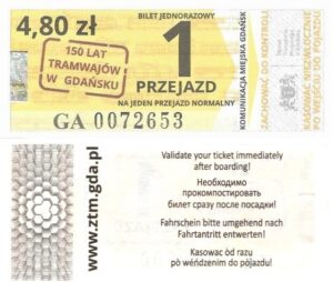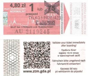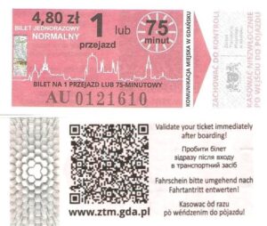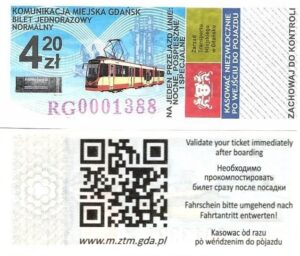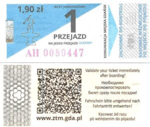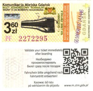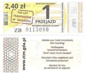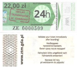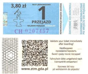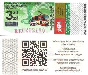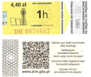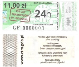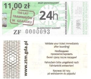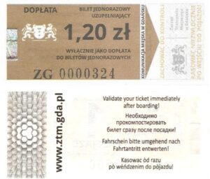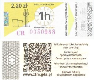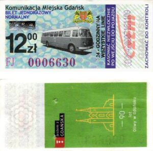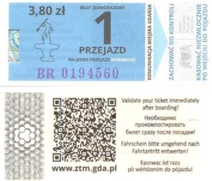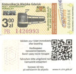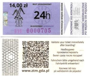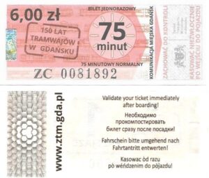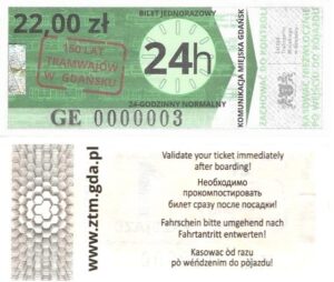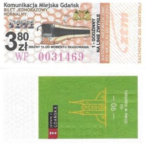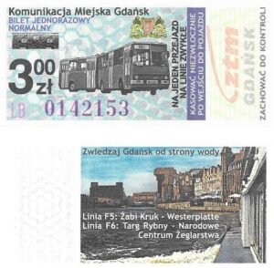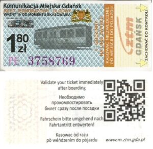 - Komunikacja Miejska Gdańsk, herb miasta, napis Zarząd Transportu Miejskiego w Gdańsku obok herbu, herb miasta w polu na wydruk z kasownika, wizerunki pojazdów obok ceny, hologram DCZG Ochrona Security, wydłużony format biletu: