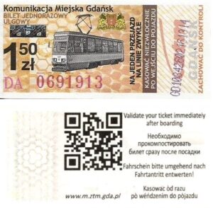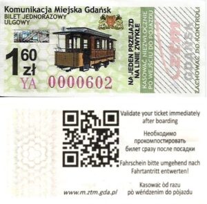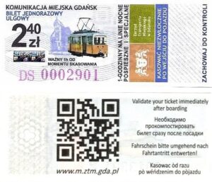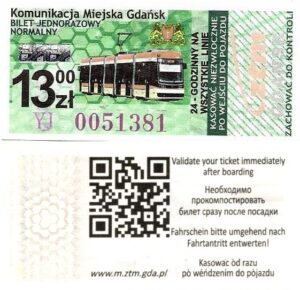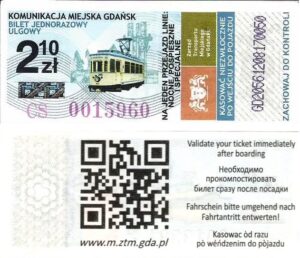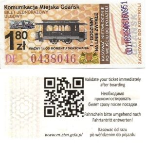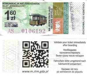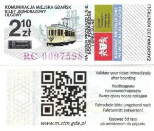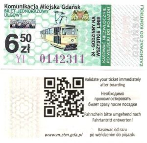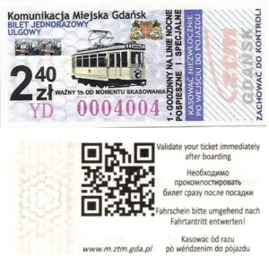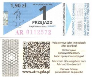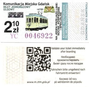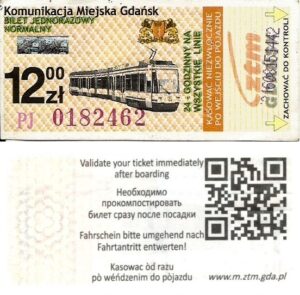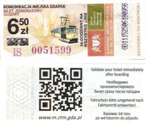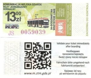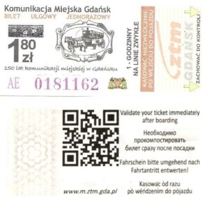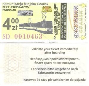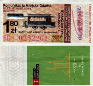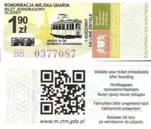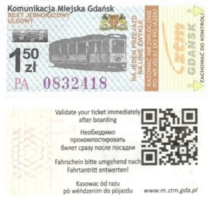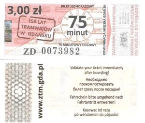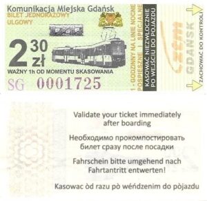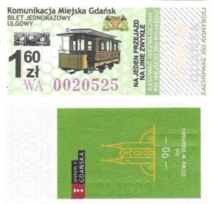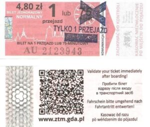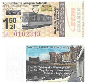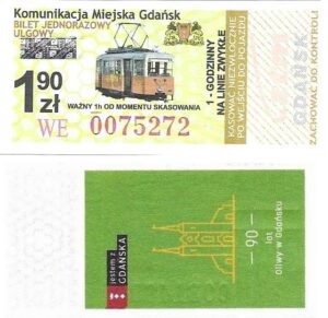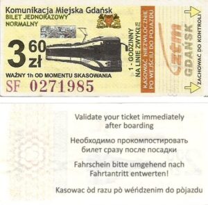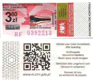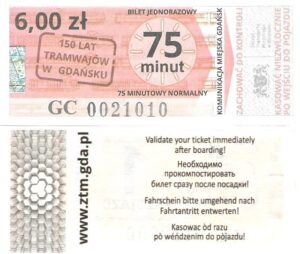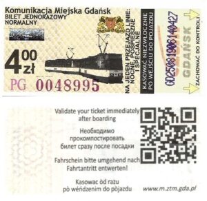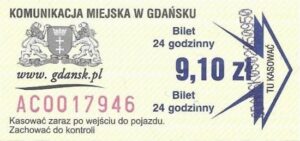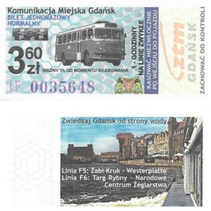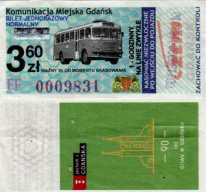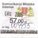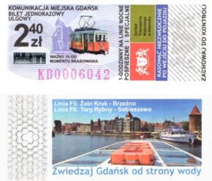 - Komunikacja Miejska Gdańsk, herb miasta, napis Zarząd Transportu Miejskiego w Gdańsku obok herbu, herb miasta w polu na wydruk z kasownika, wizerunki pojazdów obok ceny, hologram GRAF, wydłużony format biletu: