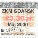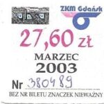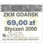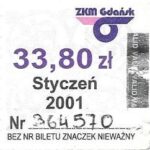 - Komunikacja Miejska w Gdańsku,cena na tle, w lewym dolnym rogu napis „ZKM GDAŃSK”, w prawym dolnym rogu napis „grafika”: