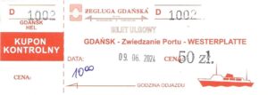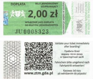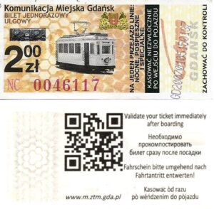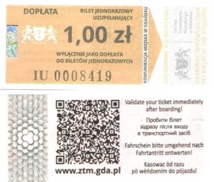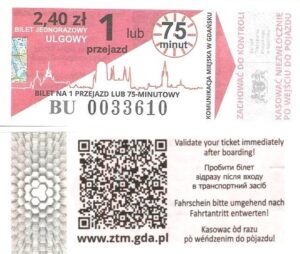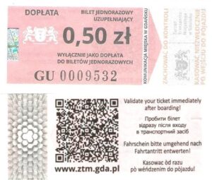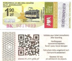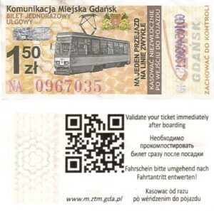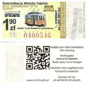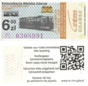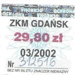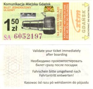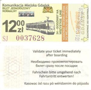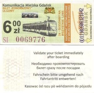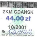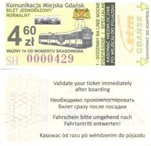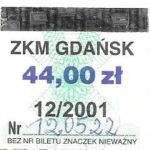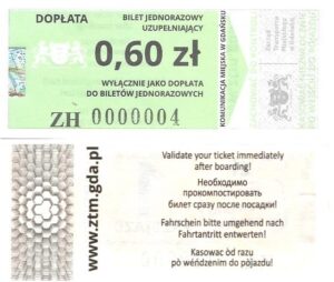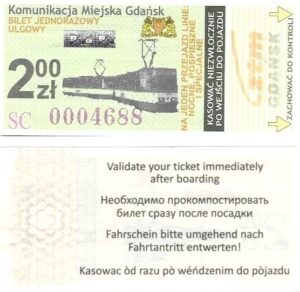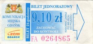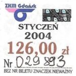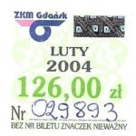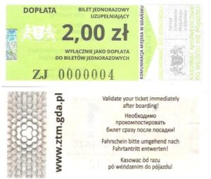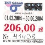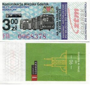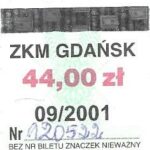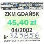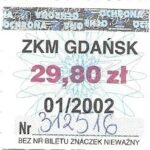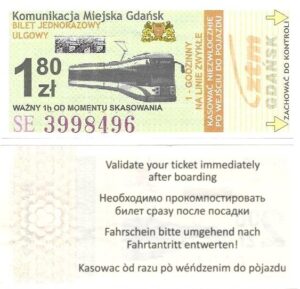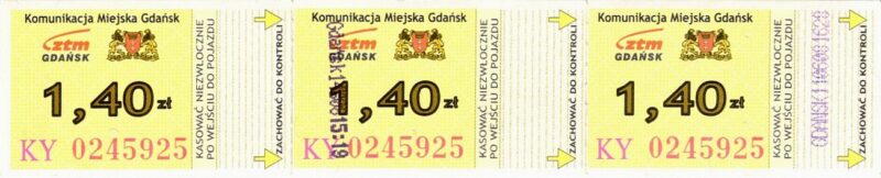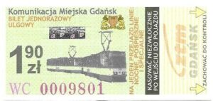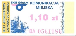 - Komunikacja Miejska Gdańsk, herb miasta, napis Zarząd Transportu Miejskiego w Gdańsku obok herbu, herb miasta w polu na wydruk z kasownika, wizerunki pojazdów obok ceny, hologram DKK, wydłużony format biletu: