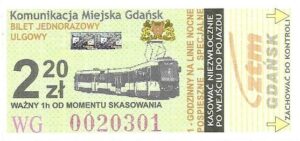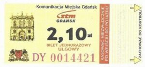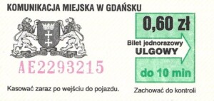 - Komunikacja Miejska w Gdańsku, herb miasta [lwy bez konturów], informacja o ważności biletu, ulgowy/pełnopłatny, w tle mikrodruk „Komunikacja Miejska Gdańsk”: