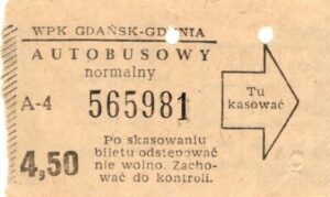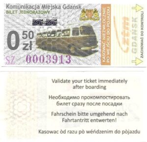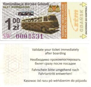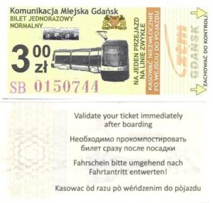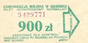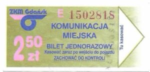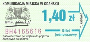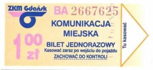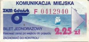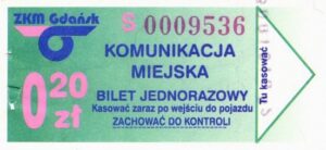 - Komunikacja Miejska Gdańsk, cena biletu w zaokrąglonym prostokącie, herb miasta obok ceny, z lewej strony biletu napis „ZKM GDAŃSK”, pole na wydruk kasownika:
