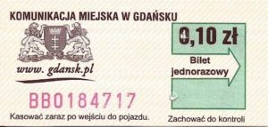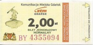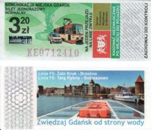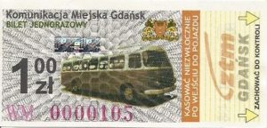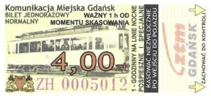 - Komunikacja Miejska Gdańsk, herb miasta, napis Zarząd Transportu Miejskiego w Gdańsku obok herbu, herb miasta w polu na wydruk z kasownika, wizerunki pojazdów obok ceny, hologram DCZG Ochrona Security, wydłużony format biletu: