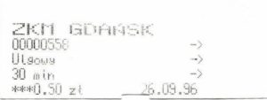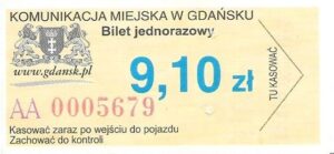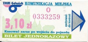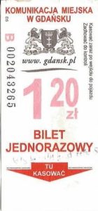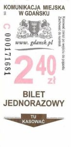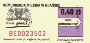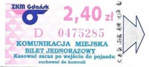 - Komunikacja Miejska Gdańsk, cena biletu w zaokrąglonym prostokącie, herb miasta obok ceny, z lewej strony biletu napis „ZKM GDAŃSK”, pole na wydruk kasownika: