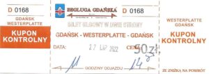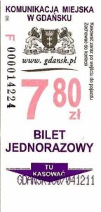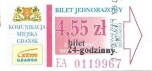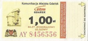 - Komunikacja Miejska Gdańsk, herb miasta, napis Zarząd Transportu Miejskiego w Gdańsku obok herbu, herb miasta w polu na wydruk z kasownika, wizerunki pojazdów obok ceny, hologram DKK, wydłużony format biletu: