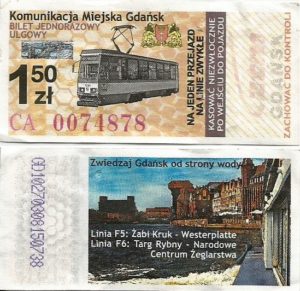 - Komunikacja Miejska Gdańsk, herb miasta, napis Zarząd Transportu Miejskiego w Gdańsku obok herbu, herb miasta w polu na wydruk z kasownika, wizerunki pojazdów obok ceny, hologram GRAF, wydłużony format biletu: