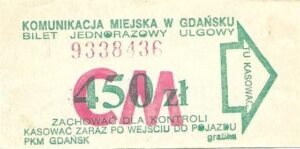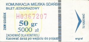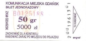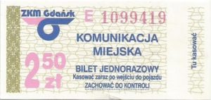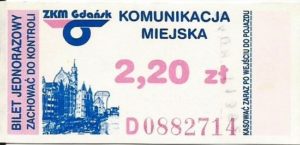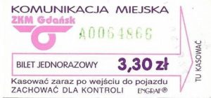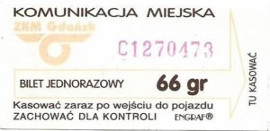 - Komunikacja Miejska Gdańsk, w tle herb miasta, tło „kwadraty i co 2 miejsca umieszczone koła”, z lewej strony biletu napis „ZKM GDAŃSK”, pole na wydruk kasownika, w prawym dolnym rogu napis „engraf”: