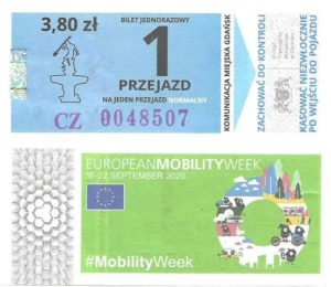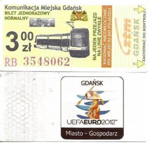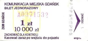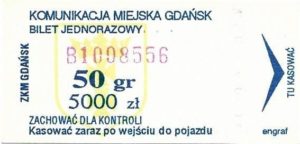 - Komunikacja Miejska Gdańsk, w tle herb miasta, tło białe, z lewej strony biletu napis „ZKM GDAŃSK”, w prawym dolnym rogu napis „engraf”: