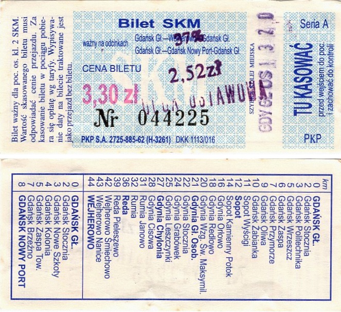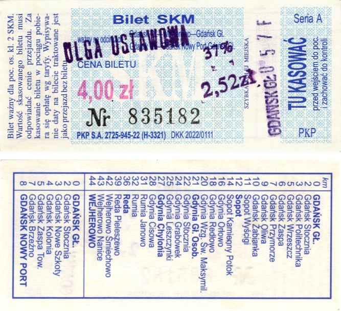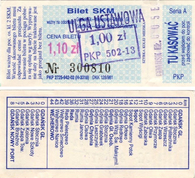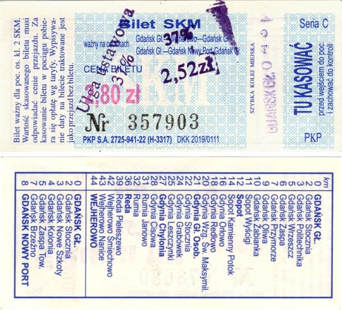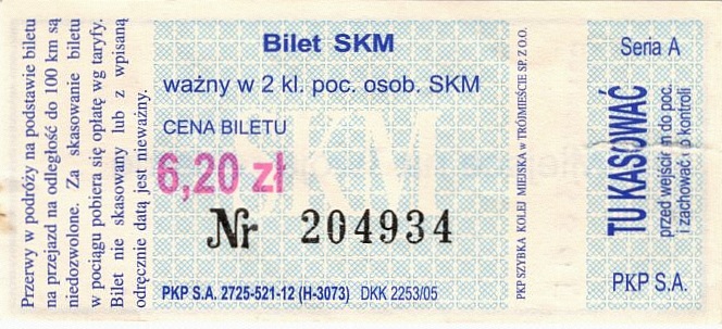 Na biletach: Szybka Kolej Miejska (obok pola na wydruk kasownika), PKP w stopce przy nr zamówienia oraz prawym dolnym rogu biletu