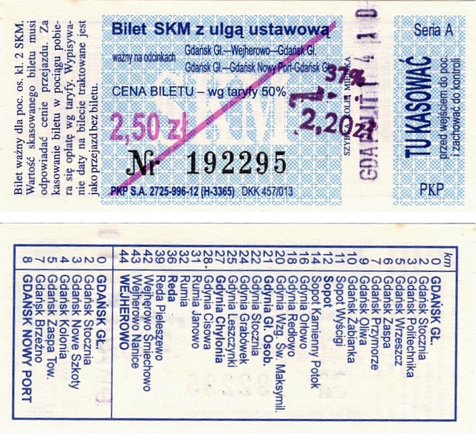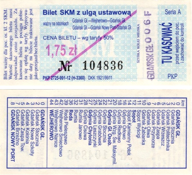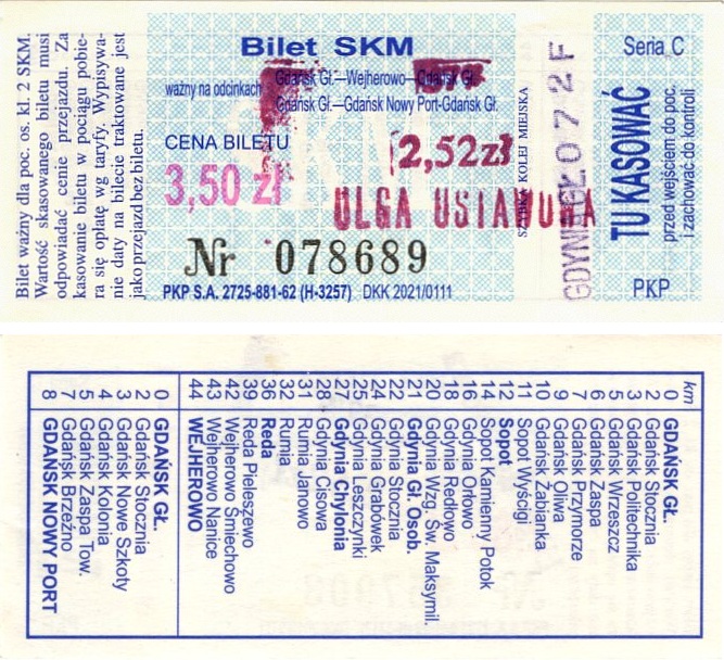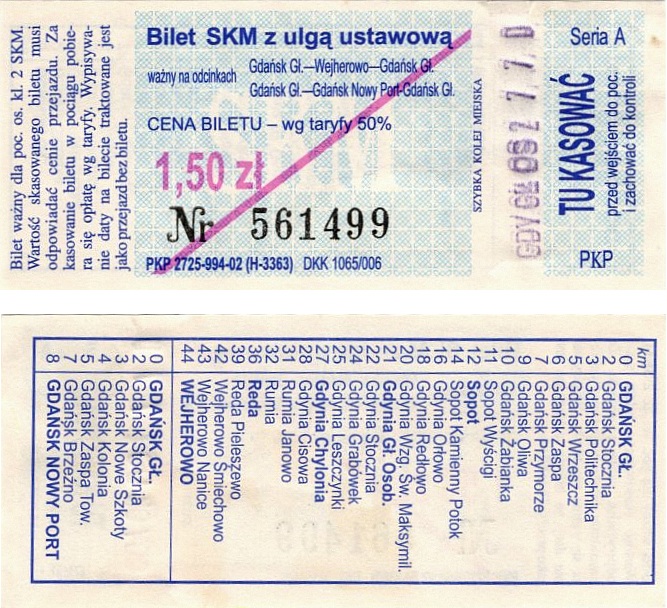 Na biletach: PKP Szybka Kolej Miejska w Trójmieście Sp. z o.o. (obok pola na wydruk kasownika), PKP S.A. w stopce przy nr zamówienia oraz prawym dolnym rogu biletu