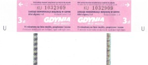 - Herb miasta w lewym górnym rogu, tło złożone z log ZKM, cena i ważność biletu w prostokątach, w prawym dolnym rogu napis CZG SA: