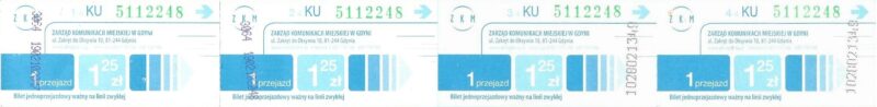 - Logotyp miasta, cena i ważność biletu na jednolitym tle, U/N, pole na wydruk kasownika: