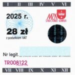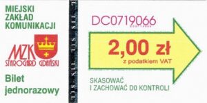 - Logo MZK, cena w strzałce z podatkiem VAT, różowy numerator, hologram „paski”: