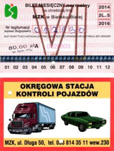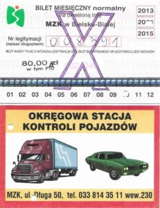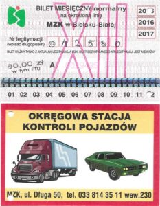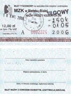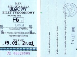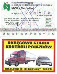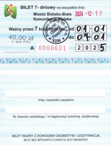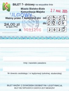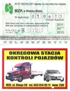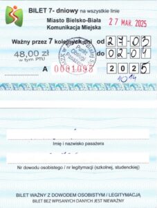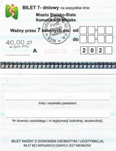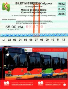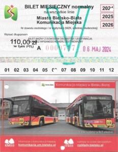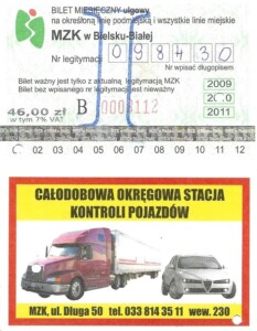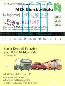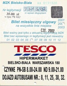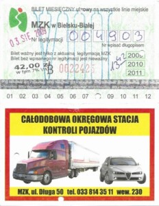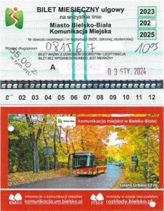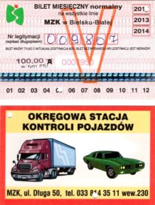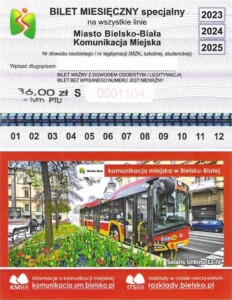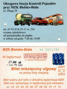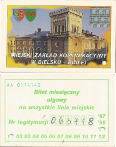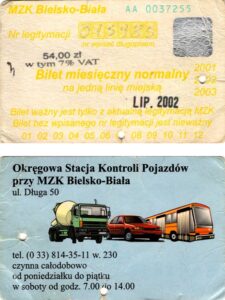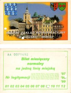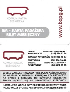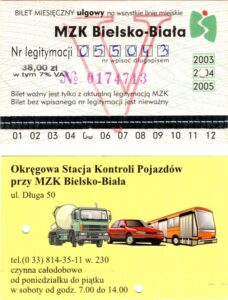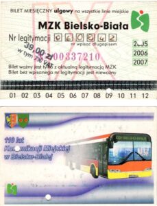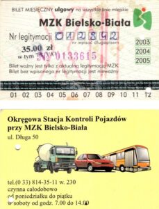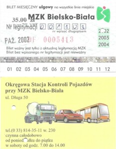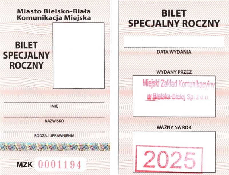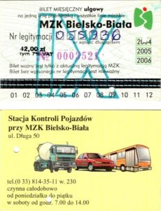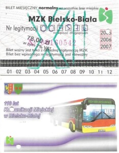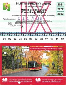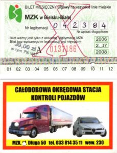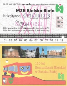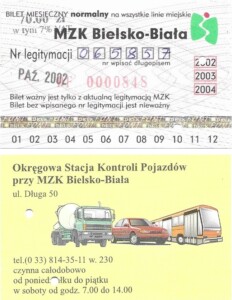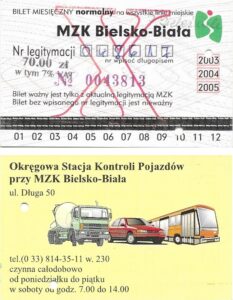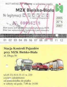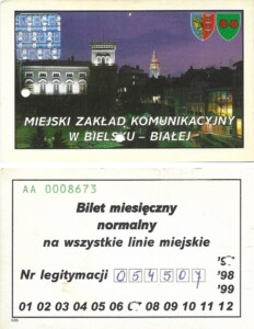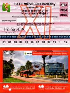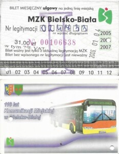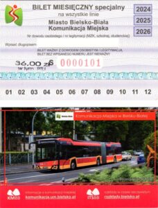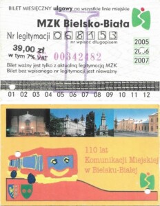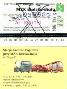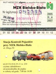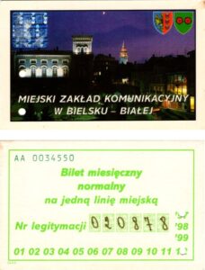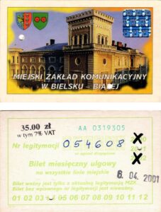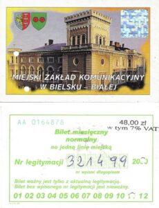 - MZK Bielsko-Biała, numerator 8-cyfrowy różowy, hologram z logotypami miasta: