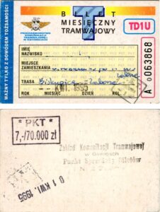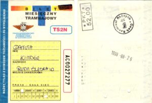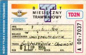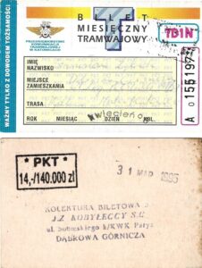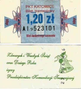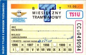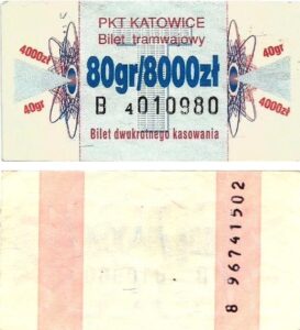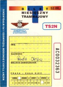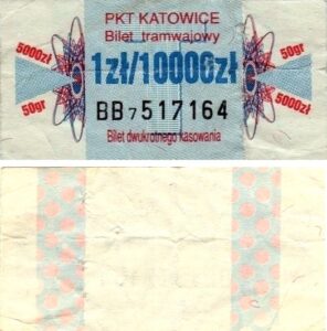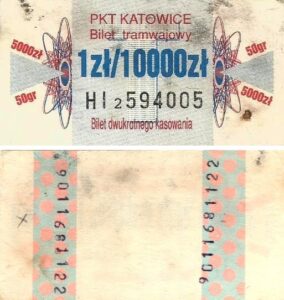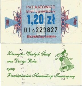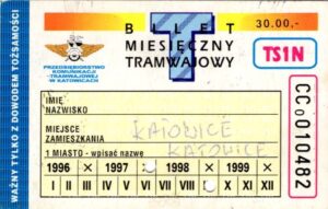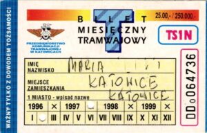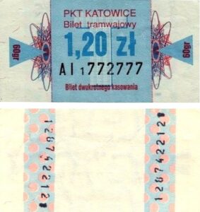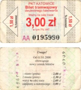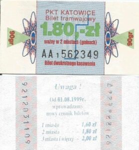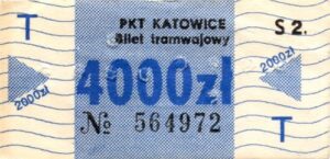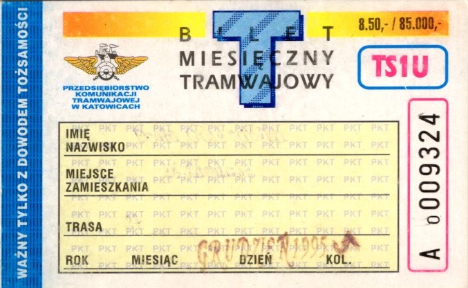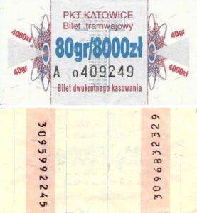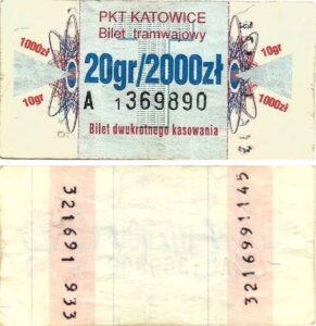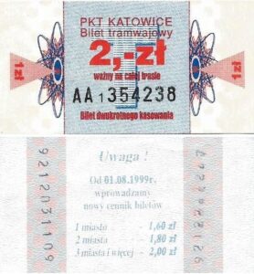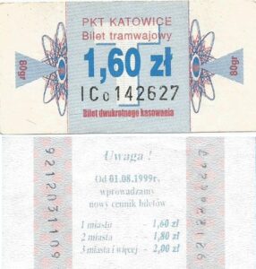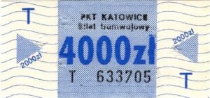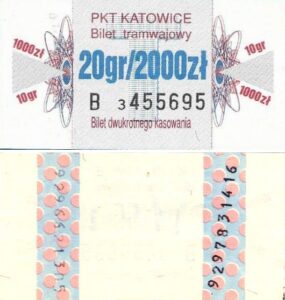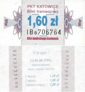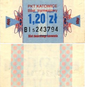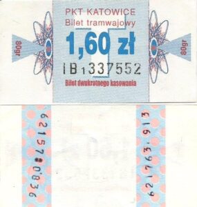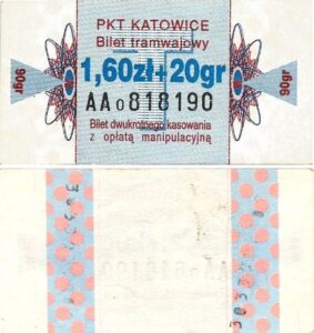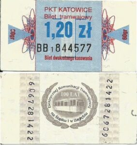 Katowice – bilety jednorazowe i okresowe PKT BILETY JEDNORAZOWE:Nieznana drukarnia:Po bokach biletu fale: W tle litera „T”: Drukarnia Kolejowa Kraków:W tle litera „T”: BILETY OKRESOWE: