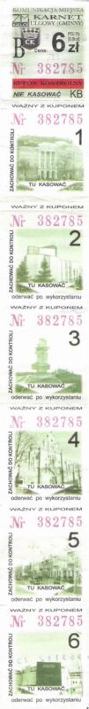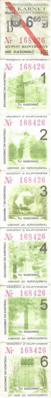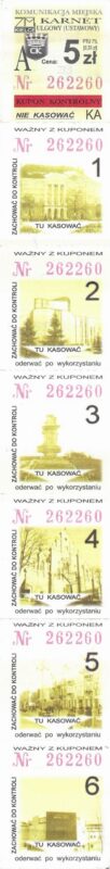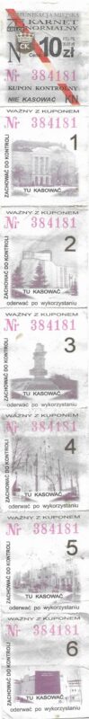• Logo ZTM z lewej strony biletu, numerator komputerowy, oznaczenie ważności, hologram z logotypami DCZG Ochrona Security z wyciętymi napisami ZTM Kielce: