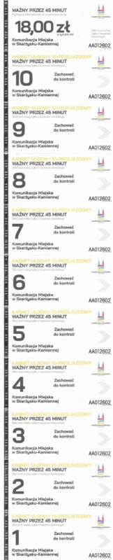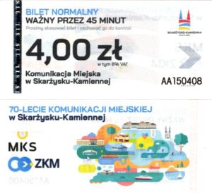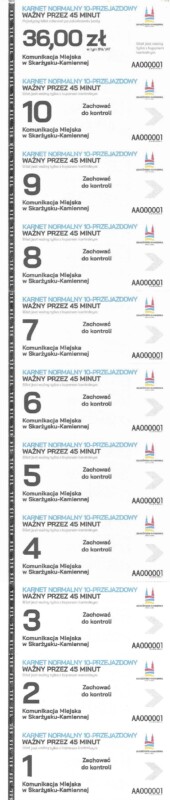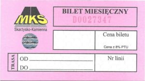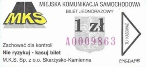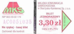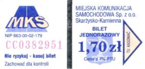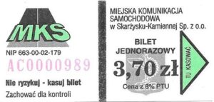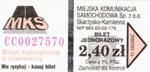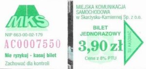- Logo MKS, Miejska Komunikacja Samochodowa w Skarżysku-Kamiennej Sp. z o.o., herb miasta w tle, numer NIP, numerator komputerowy, cena z 8% PTU, hologram GENUINE ORIGINAL: