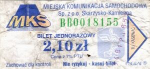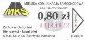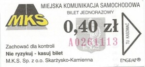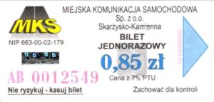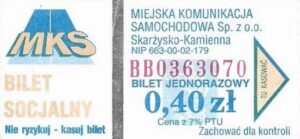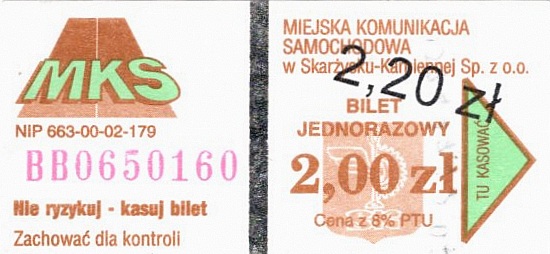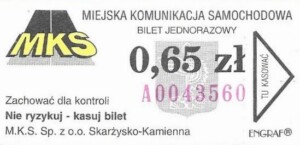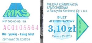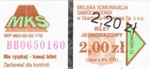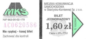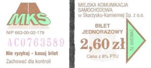 - Logo MKS, Miejska Komunikacja Samochodowa w Skarżysku-Kamiennej Sp. z o.o., herb miasta w tle, numer NIP, cena z 8% PTU, hologram GENUINE ORIGINAL: