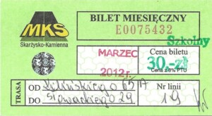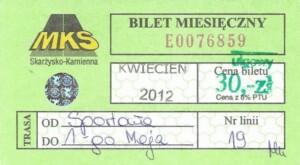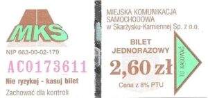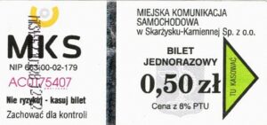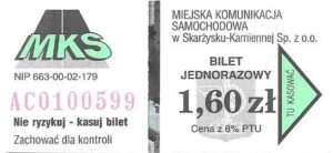 - Logo MKS, Miejska Komunikacja Samochodowa w Skarżysku-Kamiennej Sp. z o.o., herb miasta w tle, numer NIP, cena z 8% PTU, hologram „paski”: