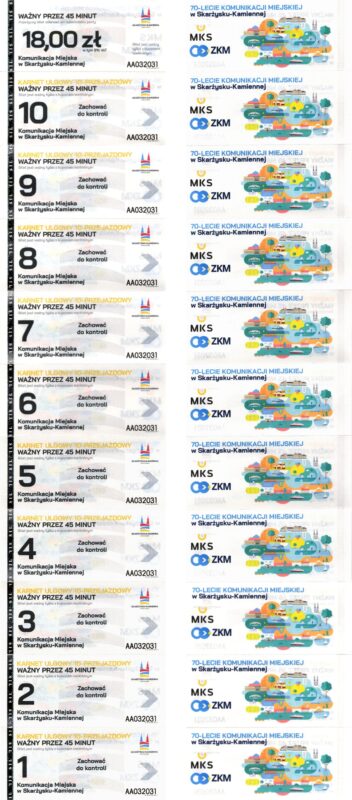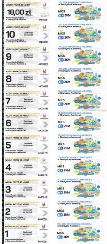 - Nowe logo MKS, Miejska Komunikacja Samochodowa w Skarżysku-Kamiennej Sp. z o.o., herb miasta w tle, numer NIP, numerator komputerowy, cena z 8% PTU, hologram GENUINE ORIGINAL: