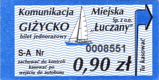 • Komunikacja miejska Sp. z o.o. „Łuczany” Giżycko, w tle szerokie fale, Nr zawijane: