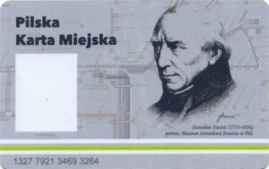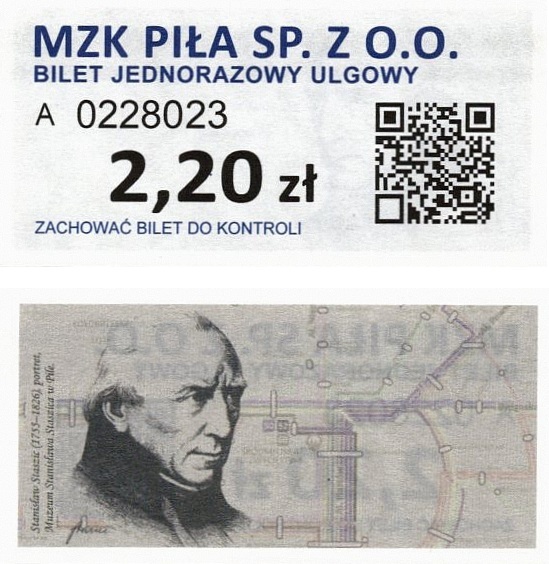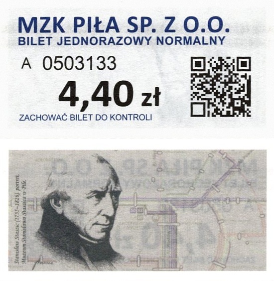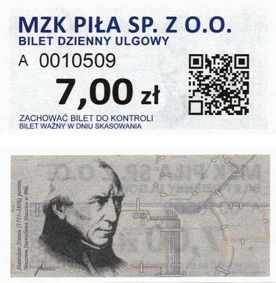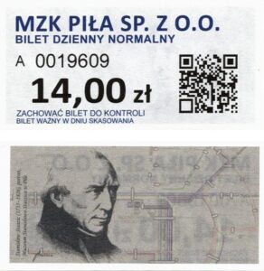 - Prostokąt z pasami w tle, kod QR na rewersie, MZK Piła Sp. z o.o., CZG Sp. z o.o.: