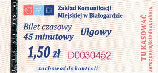 - Zakład Komunikacji Miejskiej w Białogardzie, numerator komputerowy pogrubiony, hologram GENUINE ORIGINAL z wygrawerowanymi napisami „SIL”: