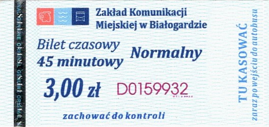 - Zakład Komunikacji Miejskiej w Białogardzie, pole na wydruk kasownika, hologram DrukFont: