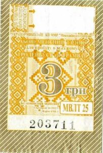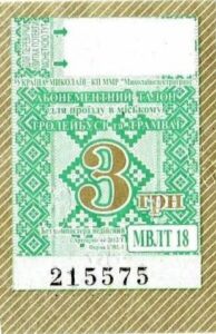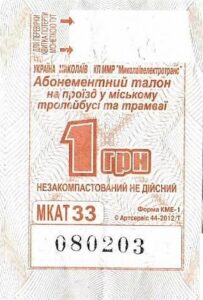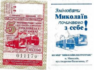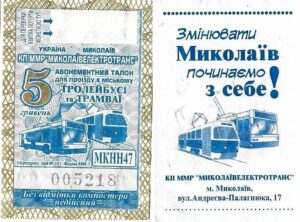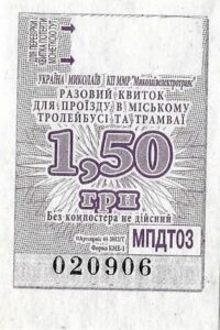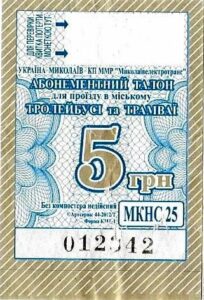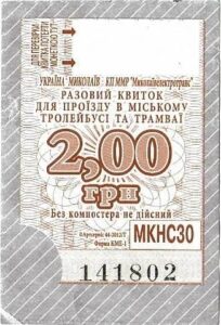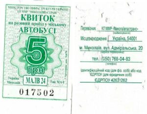 Mikołajów (Миколаїв) BILETY JEDNORAZOWE:Drukarnia Artserwis (Приватне акцiонерне товариство „Артсервiс” – ПрАТ „Артсервiс”):Nominał: Wizerunki pojazdów, nominał: