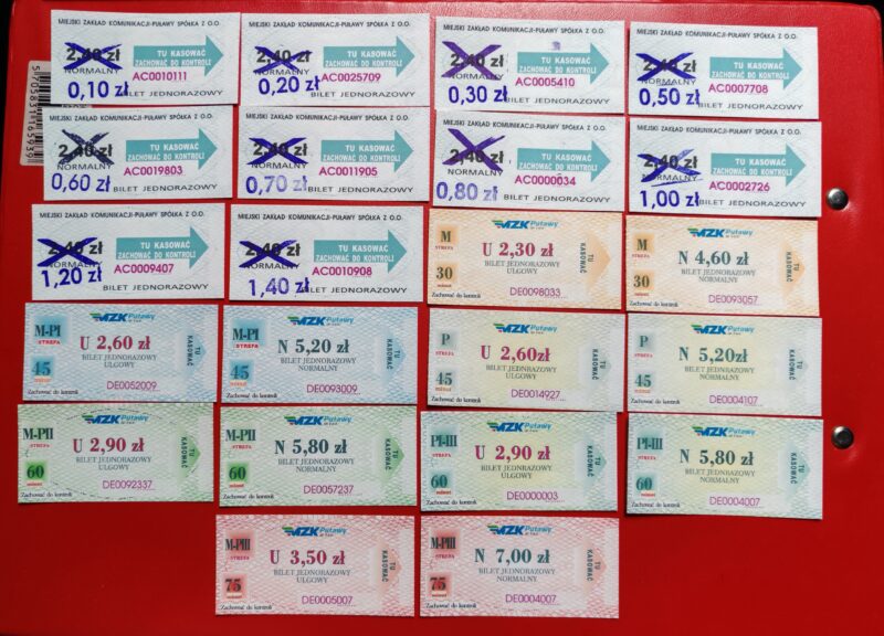 WAŻNE: w okresie od 01.05.2025 r. do 30.06.2025 r., bilety o nominałach obowiązujących do 30.04.2025 r. zachowują swoją ważność pod warunkiem jednoczesnego skasowania biletu uzupełniającego. Łączna wartość skasowanych biletów nie może być niższa od przewidzianej w nowej taryfie. Bilety uzupełniające o nominałach 0,10 zł, 0,20 zł, 0,30 zł, 0,50 zł, 0,60 zł, 0,70 zł, 0,80 zł, 1,00 zł, 1,20 zł i 1,40 zł można nabyć w kasie głównej, w siedzibie Spółki przy ul. Dęblińskiej 2A w Puławach.